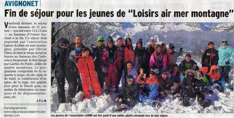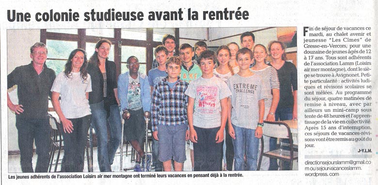 L'article paru dans le Dauphiné Libéré sur le séjour organisé par l'Association. Une petite erreur s'est glissée dans le commentaire, les séjours ne sont pas réservés aux adhérents de l' association mais ouverts à tous les jeunes de 12 à 17 ans qui ont envie de vivre une semaine à la montagne avec d'autres jeunes avant de retrouver le chemin de la rentrée.