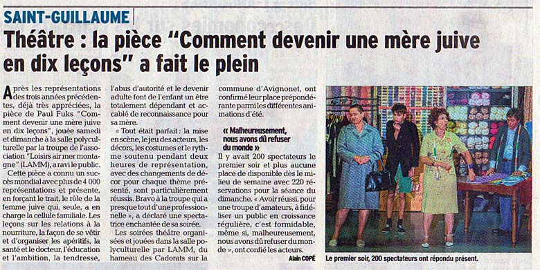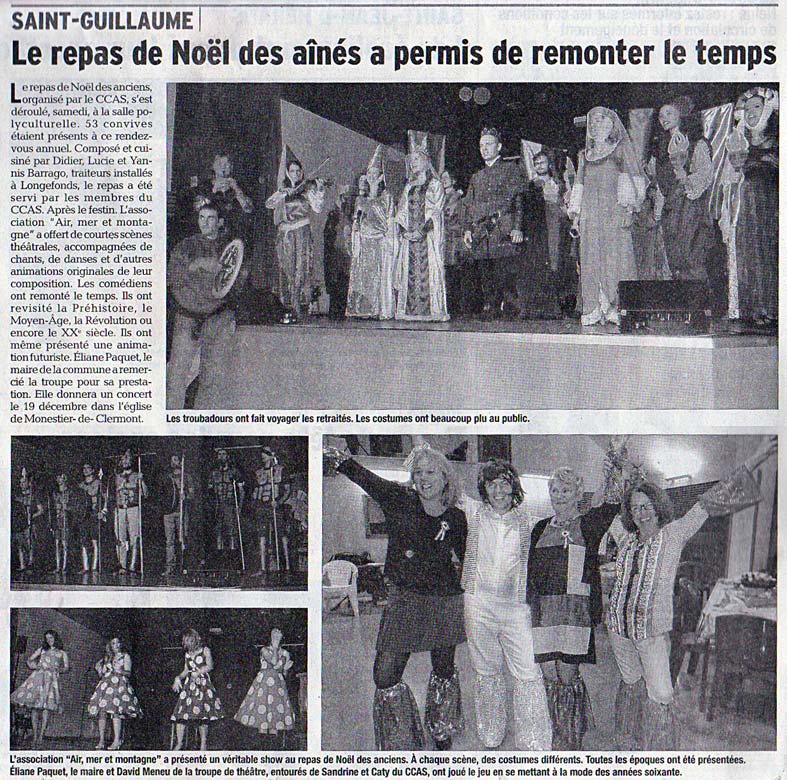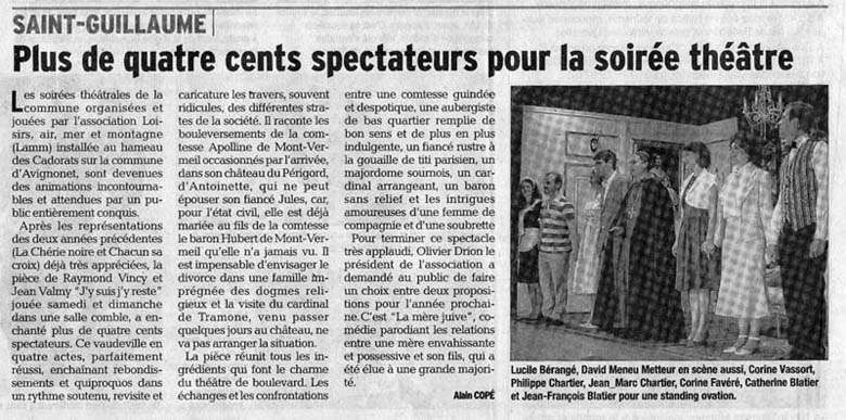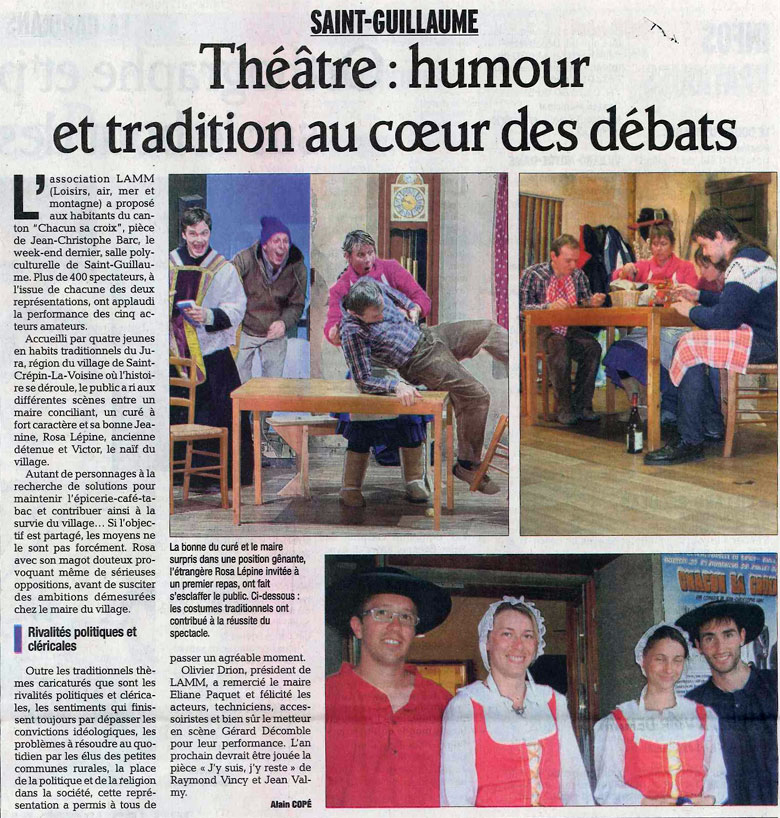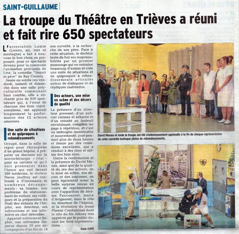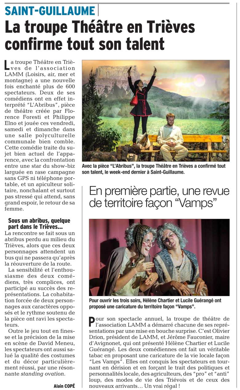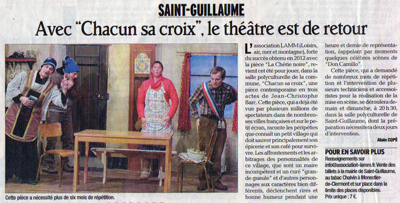 Comme chaque année, notre troupe a présenté une comédie, vendredi, samedi et dimanche du dernier week-end de juillet à Saint-Guillaume. L'article du Dauphiné Libéré du 3 août 2017 en fait un compte-rendu :